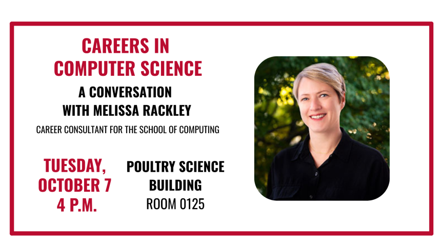 Tuesday, October 7 2025, 4 - 6pm Poultry Science Building Room 0125 Melissa Rackley Career Consultant for the School of Computing