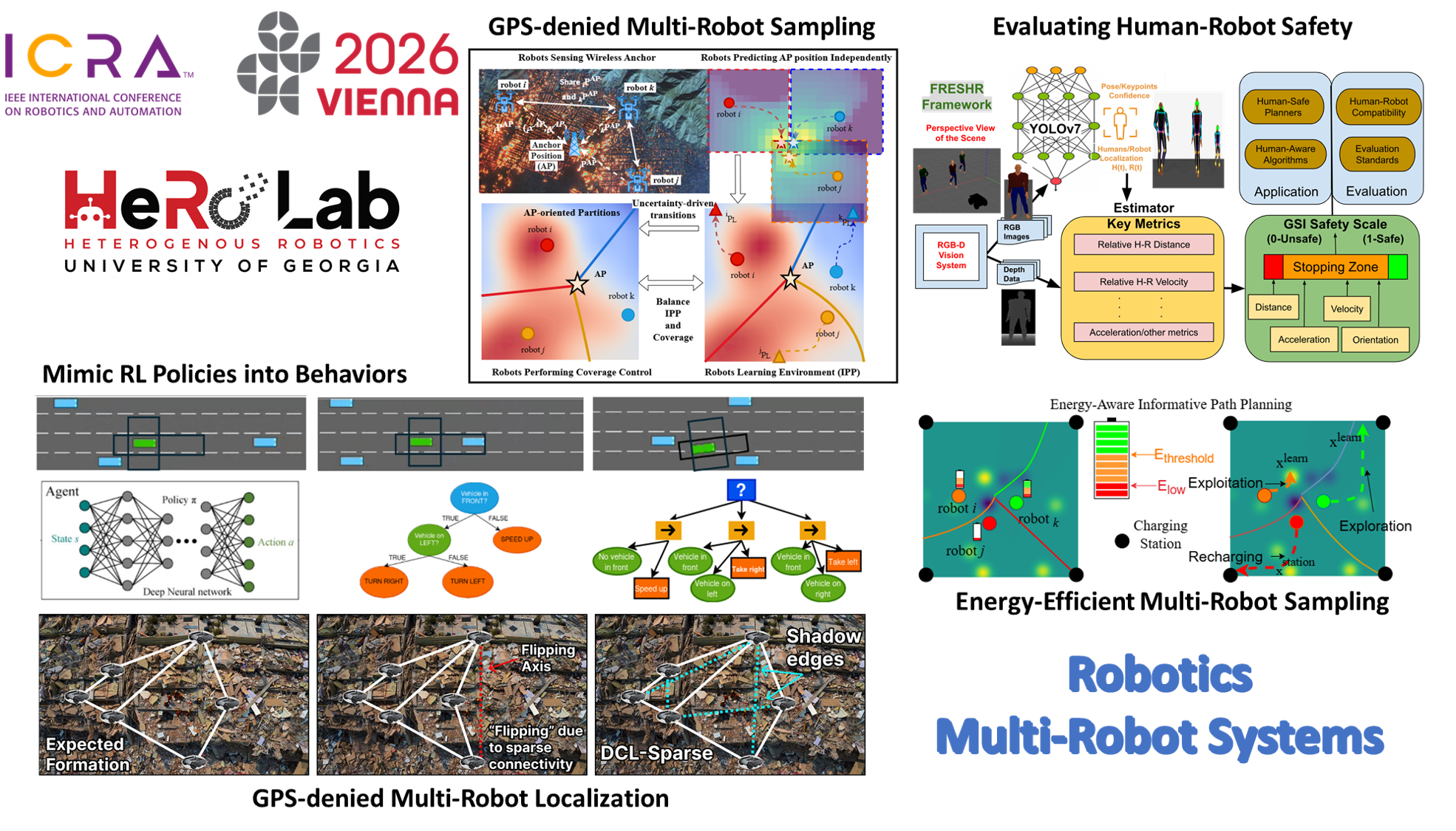 Image: The Heterogeneous Robotics Research Lab (HeRoLab) at the University of Georgia, led by Prof. Ramviyas Parasuraman, is pleased to announce that five papers have been accepted for oral presentation at the IEEE International Conference on Robotics and Automation (ICRA) 2026, the top-ranked and highly selective international conference in Robotics, and listed in CSRankings.org. ICRA 2026 will be held in Vienna, Austria, in June 2026. These acceptances highlight HeRoLab’s ongoing contributions to advancing robotics and multi-robot systems, with innovations spanning GPS-denied autonomy, multi-robot coordination, safety-aware human–robot interaction, explainable artificial intelligence, and energy-efficient persistent autonomy. Accepted Papers and Research Highlights 1) DCL-Sparse: Distributed Relative Localization in Sparse Graphs Authors: Atharva Sagale (SoC PhD Student), Tohid Kargar Tasooji (Postdoc in SoC), Ramviyas Parasuraman (Associate Professor in SoC) This paper presents a new distributed localization approach that enables robot teams to accurately determine their positions in GPS-denied environments with sparse and noisy connectivity. The proposed method significantly improves robustness and scalability, achieving up to a 95% reduction in localization error compared to state-of-the-art techniques. 2) Multi-Robot Informative Sampling and Coverage in GPS-Denied Environments (Conference forthcoming) Authors: Aiman Munir (SoC PhD Alumni), Ehsan Latif (SoC PhD Alumni), Ramviyas Parasuraman (Associate Professor in SoC) This work introduces a framework that allows robot teams to explore, map, and collect informative data without relying on GPS. By balancing informative sampling and spatial coverage under localization uncertainty, the approach outperforms alternative GPS-denied methods by up to 54%, while achieving performance comparable to GPS-based systems. 3) Imitation-BT: Automating Behavior Tree Generation by Echoing Reinforcement Learning Agents Authors: Shailendra Sekhar Bathula (MSAI Alumni), Ramviyas Parasuraman (Associate Professor in SoC) This paper addresses the challenge of deploying opaque reinforcement learning policies in safety-critical systems. The proposed method automatically converts learned policies into transparent, interpretable behavior trees, retaining high task performance while significantly improving explainability, trust, and verification ease. 4) Energy-Aware Informative Path Planning for Heterogeneous Multi-Robot Systems (Conference forthcoming) Authors: Aiman Munir (SoC PhD Alumni), Ayan Dutta (Associate Professor, University of North Florida), Ramviyas Parasuraman (Associate Professor in SoC) This work presents an energy-aware planning framework for long-term, persistent multi-robot deployments. By explicitly accounting for robot energy states and task uncertainty, the method enables efficient transitions between exploration, exploitation, and recharging, achieving up to 32% energy savings while maintaining high-quality environmental reconstructions. 5) FRESHR-GSI: A Generalized Safety Model and Evaluation Framework for Mobile Robots in Multi-Human Environments Authors: Pranav Pandey (SoC PhD Student), Ramviyas Parasuraman (Associate Professor in SoC), Prashant Doshi (Professor in SoC) This paper introduces a new framework for quantifying human safety around mobile robots operating in shared spaces. By incorporating human–robot distance, velocity, orientation, and other dynamic factors, the approach delivers more accurate and responsive safety assessments than existing models, supporting safer deployment of robots in public and human-centered environments.Additional details for the papers, including preprints, videos, and open-source code, are available at:https://hero.uga.edu/publications Acknowledgments We gratefully acknowledge the resources and support from the School of Computing and extend our congratulations to the students and alumni of the HeRoLab, as well as external collaborators, for their contributions to this work. This research was supported by the funding agencies, including NIFA, ARL, and DEVCOM, whose support is essential to the success of this research.The team looks forward to presenting these results at ICRA 2026 in Vienna and engaging with the international robotics research community. Type of News/Audience: Research